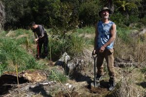 The Forest & Bird Eco-Team has been prepping the site and removing invasive weeds for months, with a little help from J & S Mears Contracting who is also on-hand for planting.